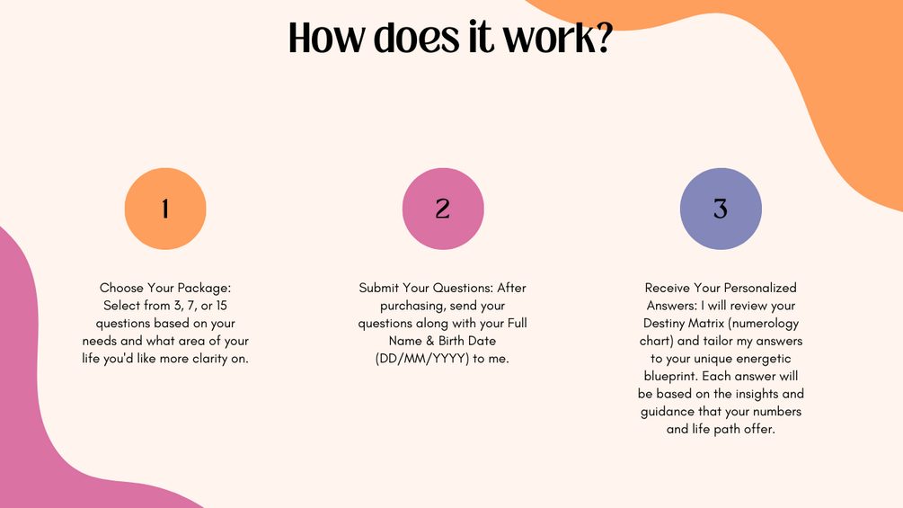 1️⃣ Choose Your Package: Select from 3, 7, or 15 questions based on your needs and what area of your life you'd like more clarity on.